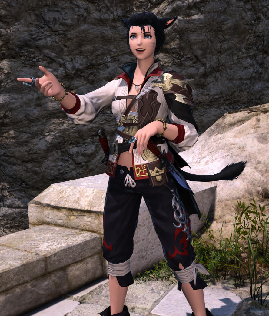 Naia isn't particularly well-known among adventurers, but she's held in good regard by those who know her work. Never one of those driven adventurers, Naia nearly always got the job done when she bothered to actually take a job, which was only after spending away her gil on food, music, and exotic dancers - a bon vivant as long as there was a coin in her pouch. Things eventually did settle out for her once she started taking on retainer work, which got her in contact with more-focused adventurers, most notably Keilis Starfall. Their skills paired well, and their partnership brought her both the challenge and the consistency she needed.Those few that have worked with her in recent years know that she's just as clever and daring as she always was, but with significantly more tricks, training, and experience to bring to bear. While not a "proper" shinobi, her skills in silent sneaking and subtle action rival any, and she's much more capable of swift and decisive violence than her usual demeanor - enthusiastic and cheery - might suggest.