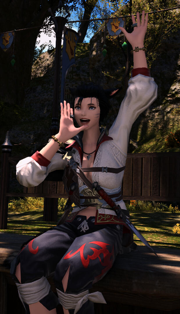 Enjoying fun is far from a unique trait, but Naia leans into it harder than most. Left to her own devices, this miqo'te would spend every waking moment prowling whichever city she's in - mastering the ebb and flow of swirling shoppers and toiling workers, pathfinding through alleyways and across rooftops, and cheering on each and every dancing woman and man. While not much of a drinker herself, watering holes are always such interesting places to her, and she's even learned how to mix some drinks of her own!